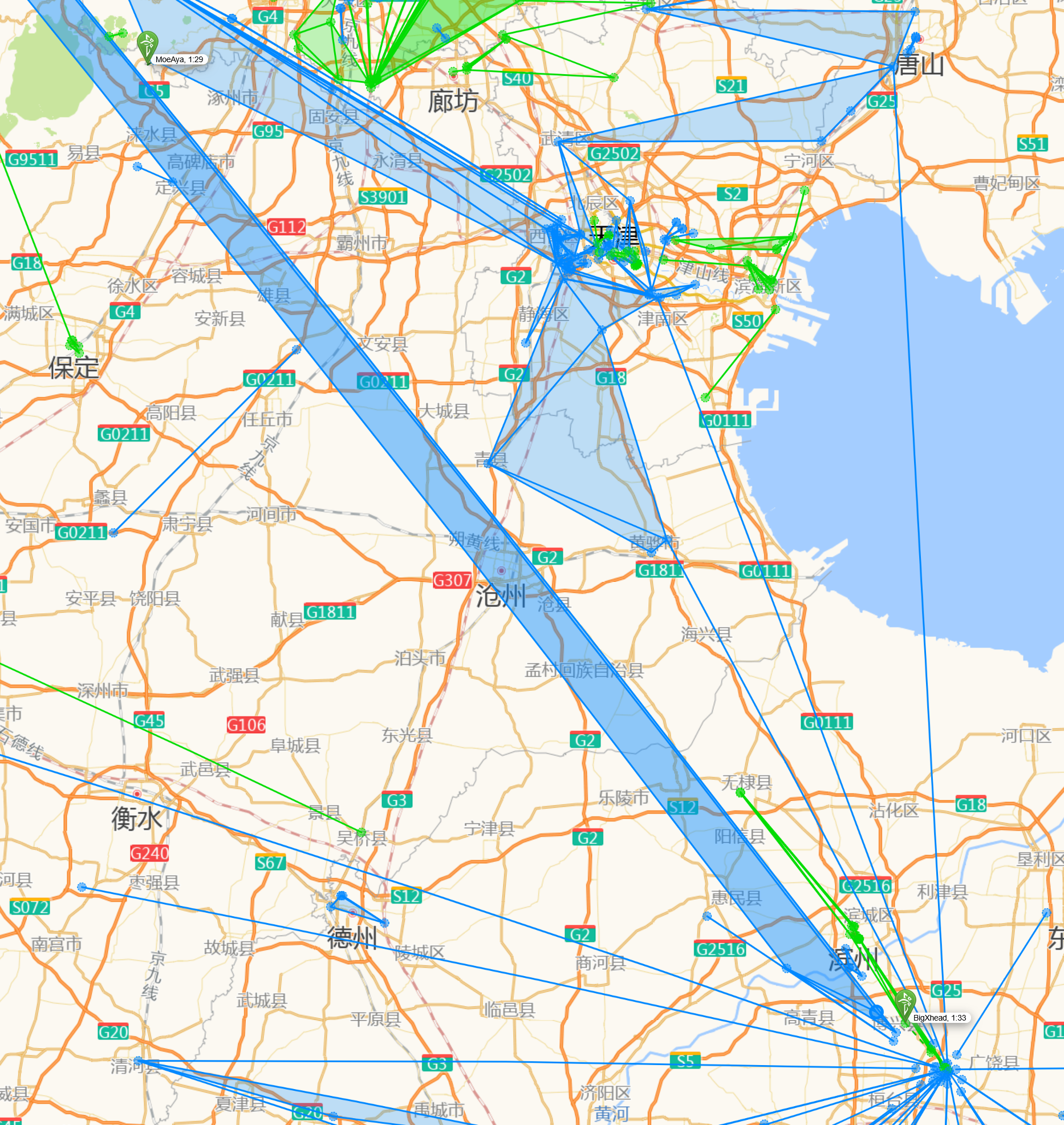 1月17日下午,MoeAya 前往房山十渡清理了蓝 link。19日凌晨,抵达淄博的 BigXhead 与再次前往房山十渡的 MoeAya 配合,依次清理了几条射向蒙古的蓝 link,并拉上了挡线。天津蓝军 Xyinkl 也从天津向门头沟百花山射出了多条 link(可惜在天津一侧与计划要连的 link 交叉了,不然就是完美护航了)。